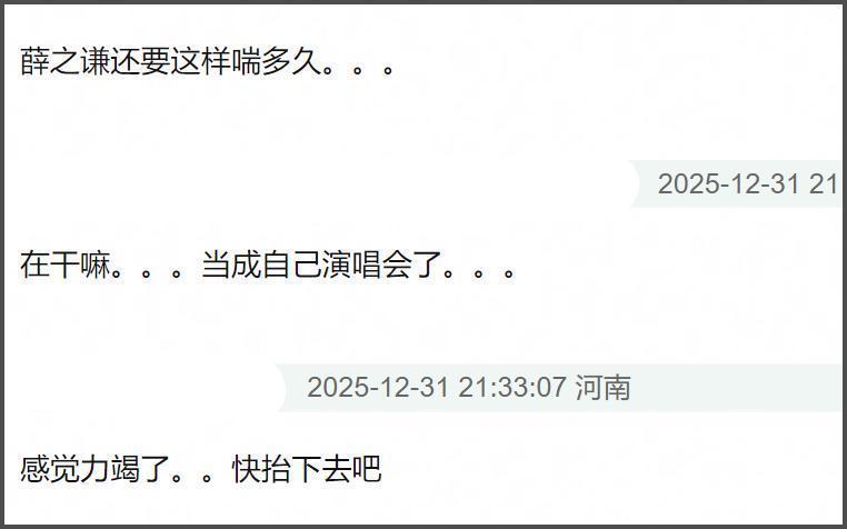 薛之谦也是把江苏卫视当自己演唱会了,唱着唱着就开始递话筒,但这是跨年晚会直播,台下观众的声音录不上啊,在观众听来就是唱着唱着没声了,观感并不是很好。